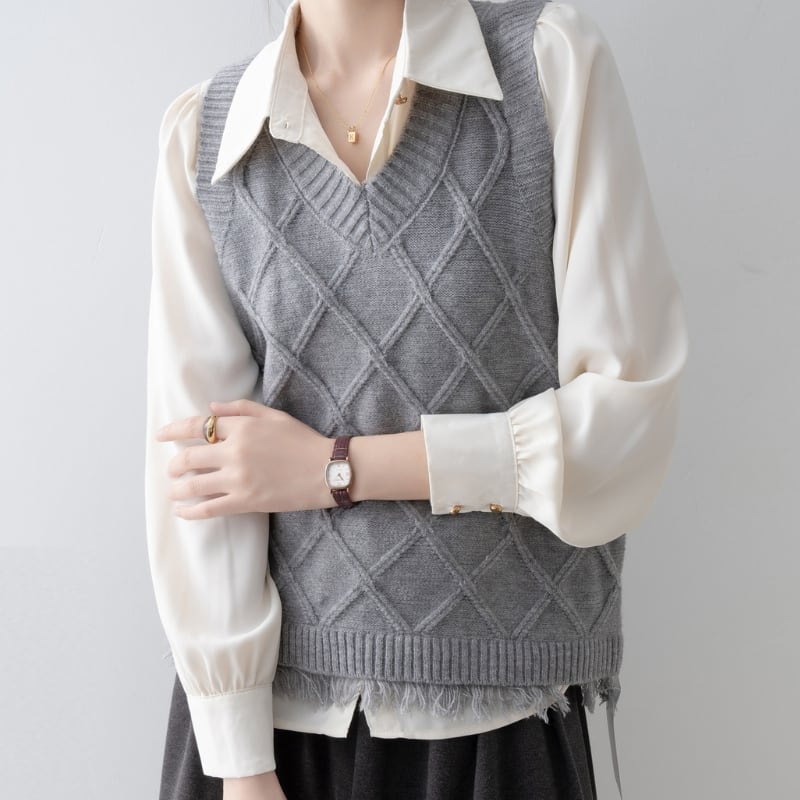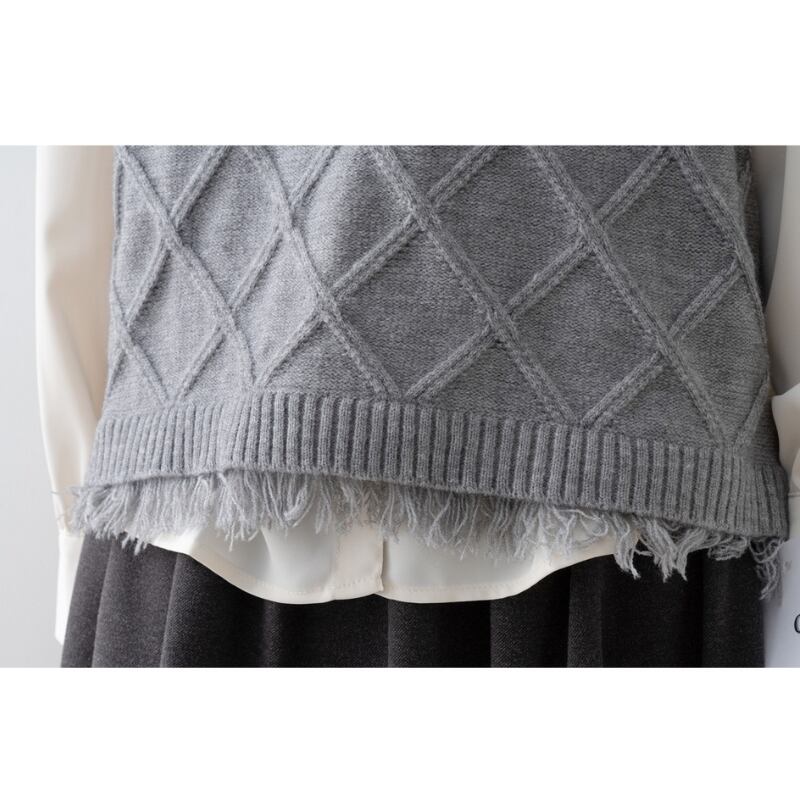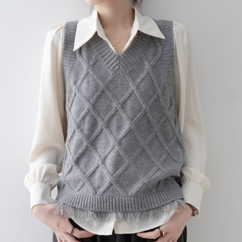 アラン編み フリンジデザイン Vネックノースリーブ ベスト 1col N00016