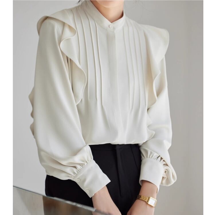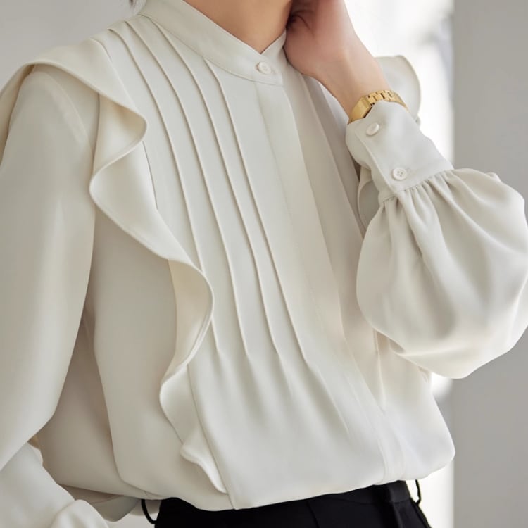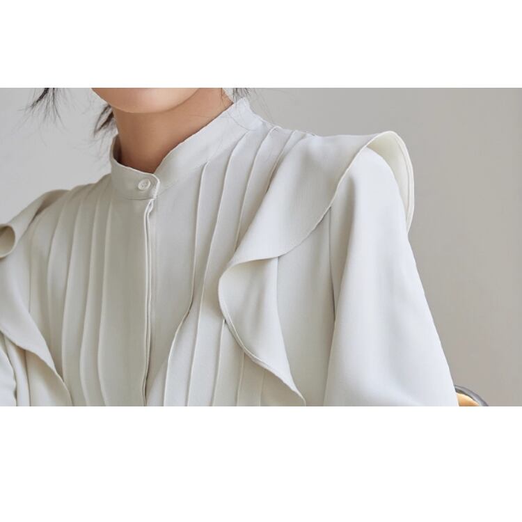 プリーツとフリルが繊細な表情を添える、スタンドカラーのロングスリーブブラウス。