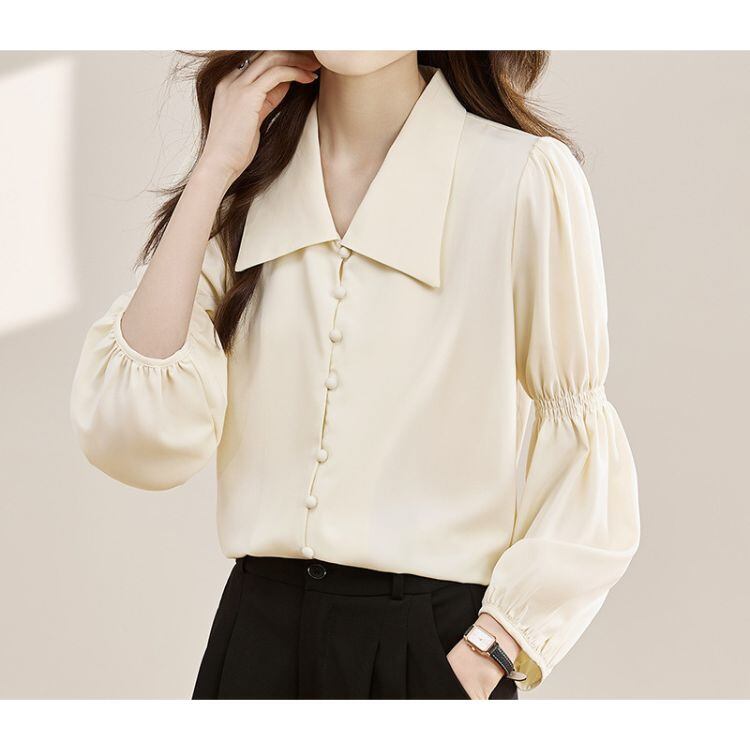 上品なワイドカラーと、ふわりと可愛いランタンスリーブが魅力のブラウス。