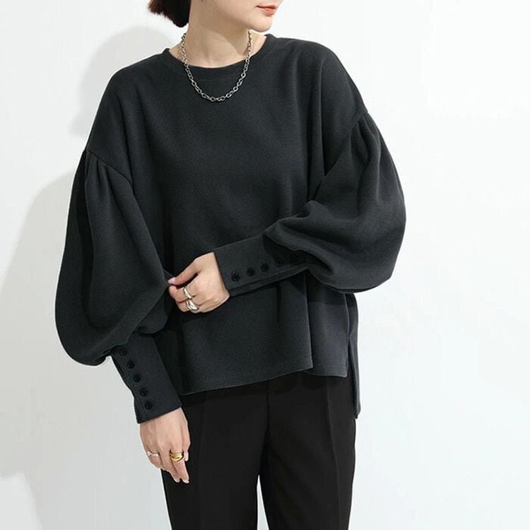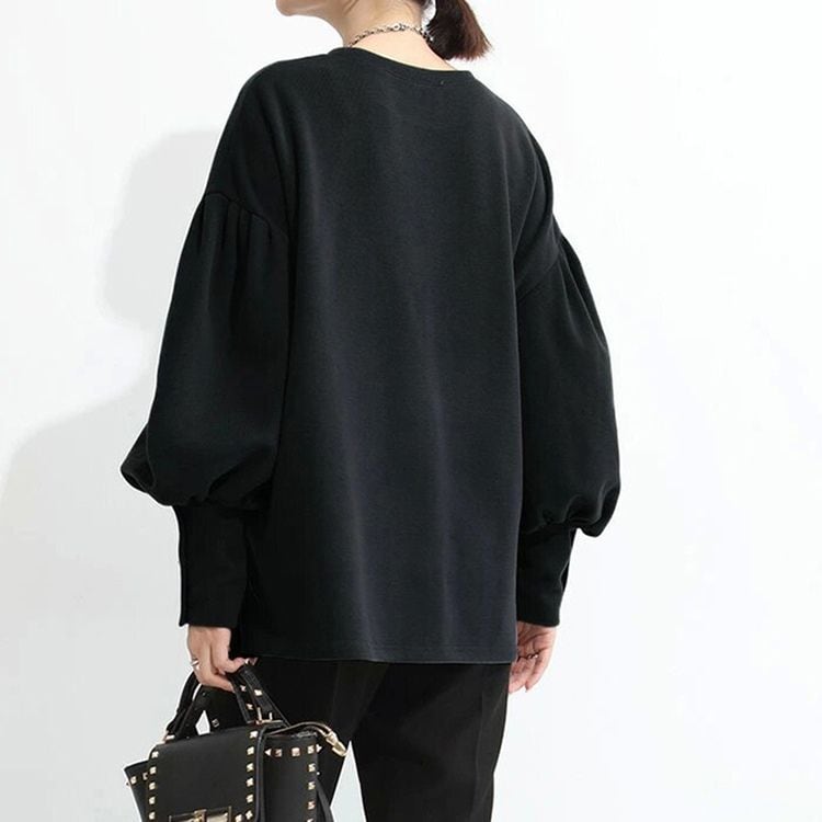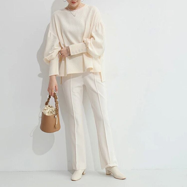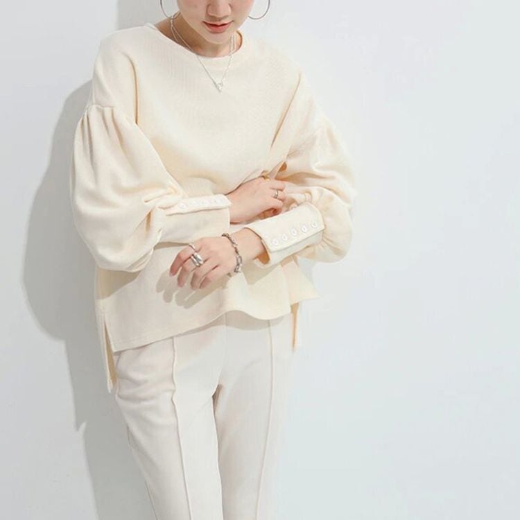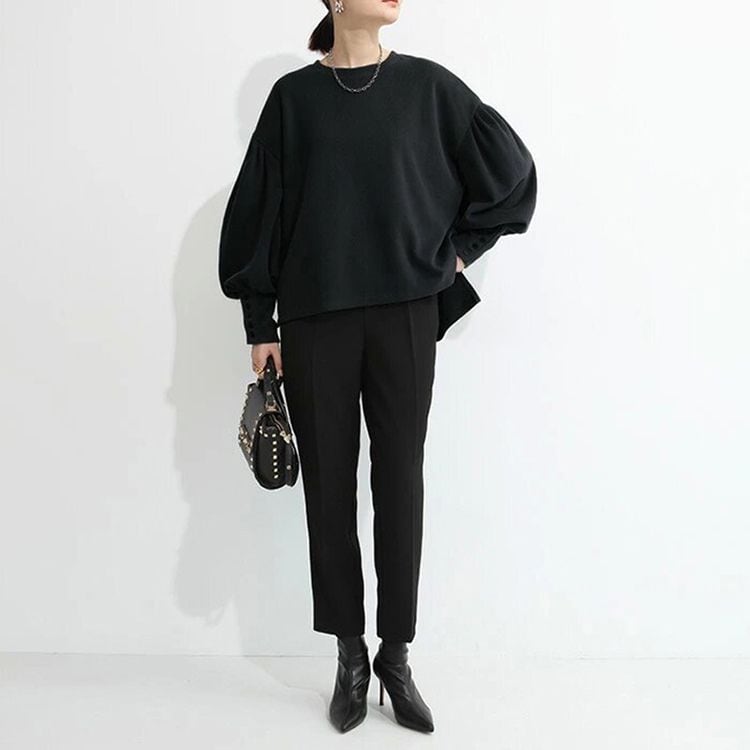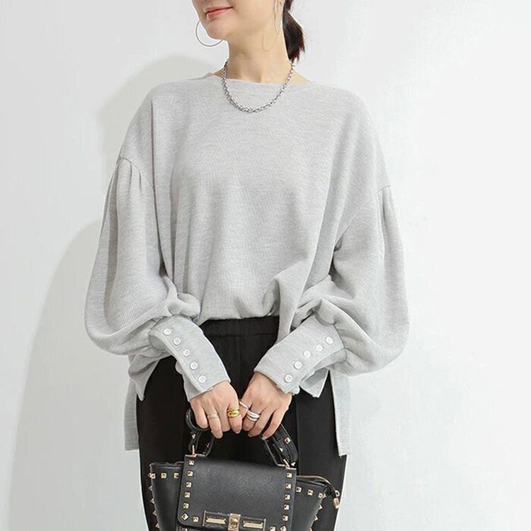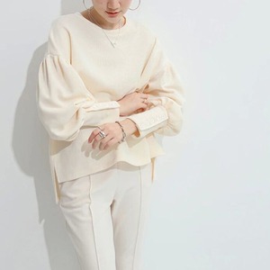 バルーンスリーブが女性らしい、ラウンドネックのニットソー。