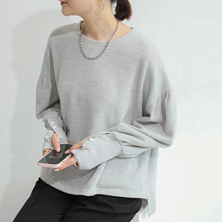 袖口のボタンデザインがさりげない細見えアクセントとなり、カジュアルながらも洗練された印象を与えます。
