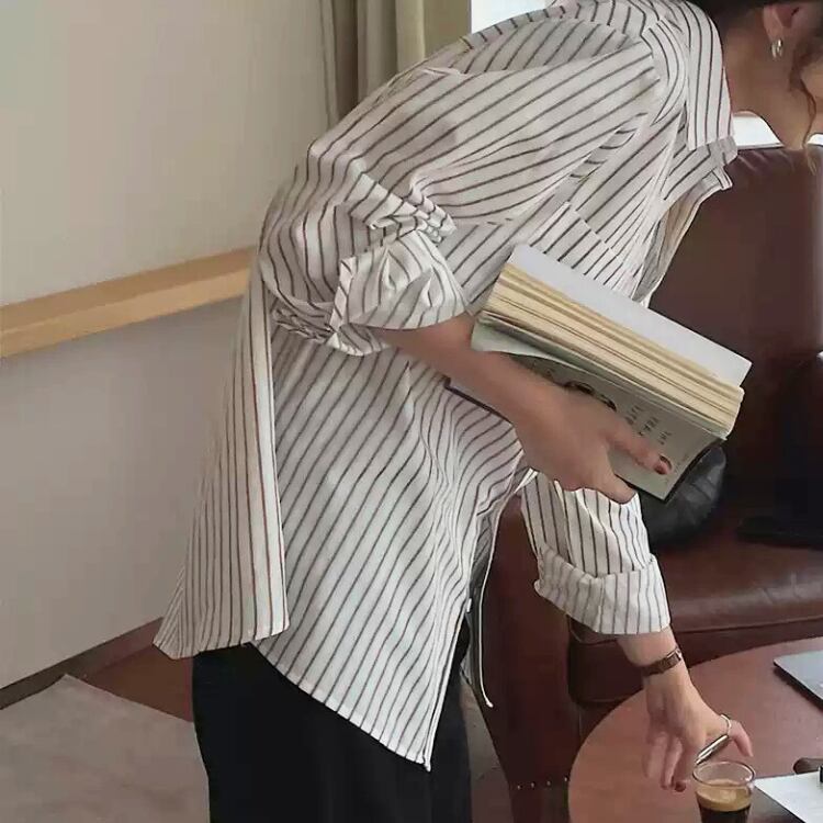 大人っぽい着こなしが叶う、ストライプ柄のロングスリーブシャツ。
