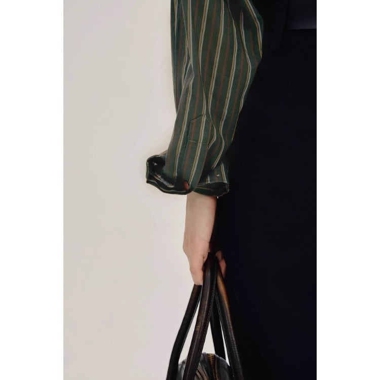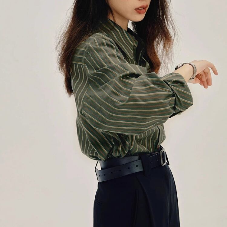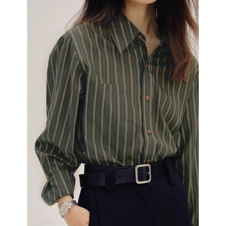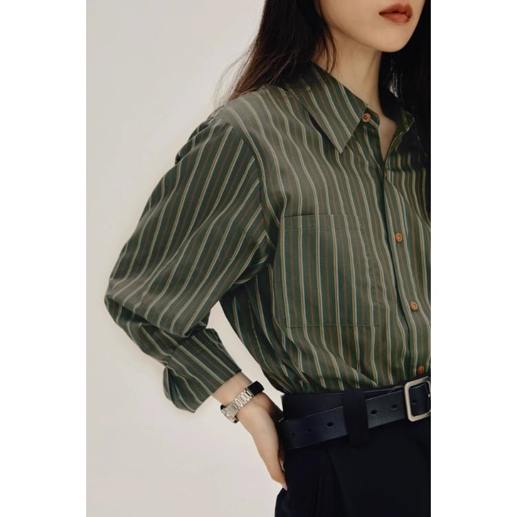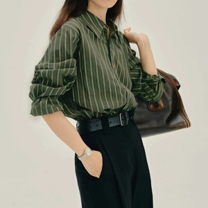 大人っぽく、そしてどこか可愛らしい着こなしを実現する、ストライプ柄ロングスリーブシャツ。