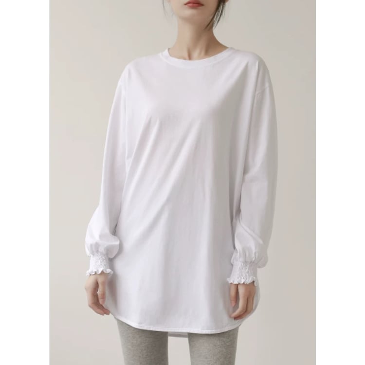 シャーリング袖と裾ラウンドがポイントのロングTシャツ。