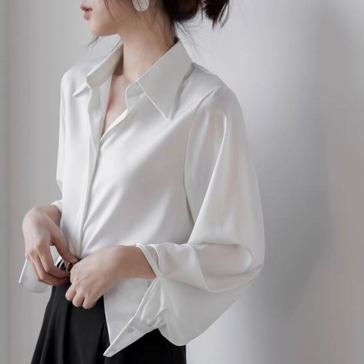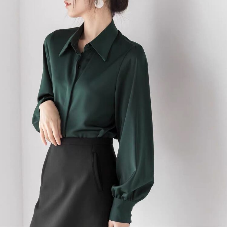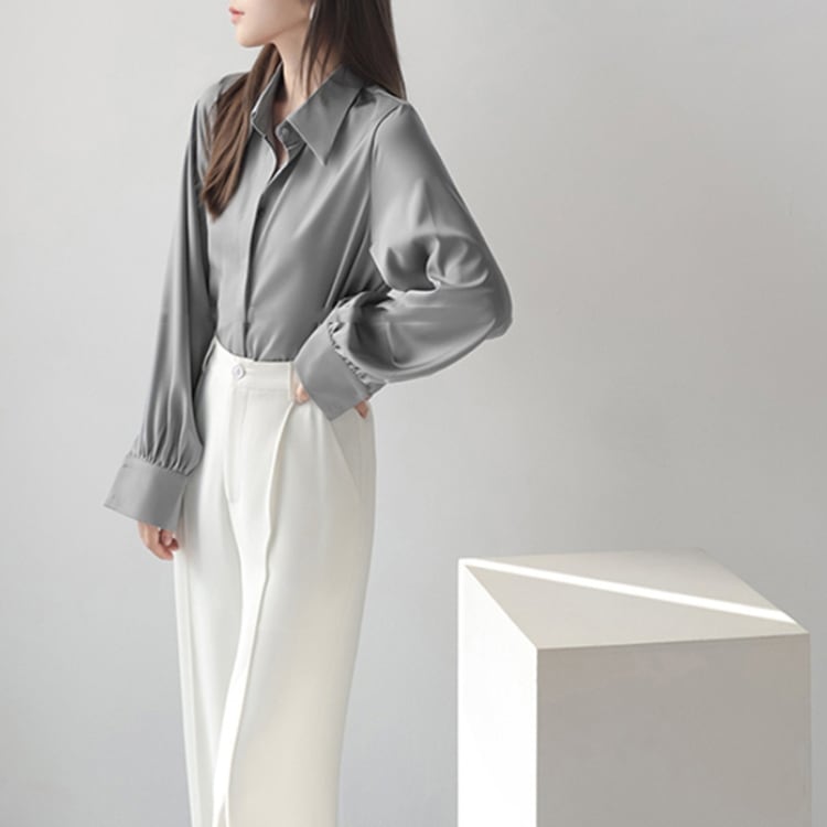 大人っぽい着こなしを叶える、レギュラーカラーのロングスリーブブラウス。