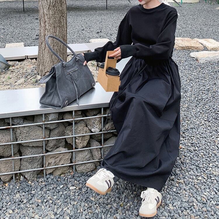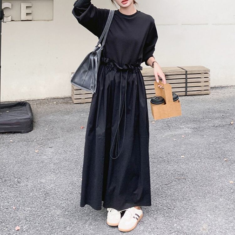 クルーネックロングスリーブ ドローストリング付き ドッキングワンピース 1col N00124