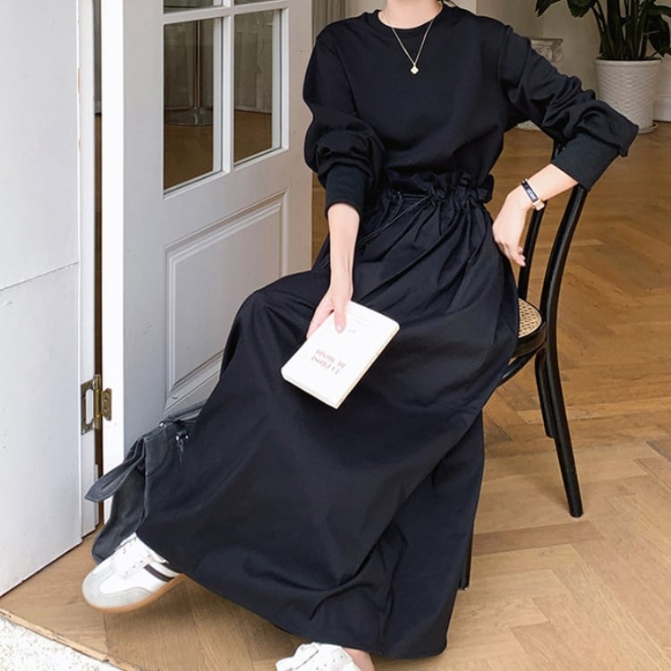 ロング丈のスカートが、上品で落ち着いた雰囲気を醸し出します。