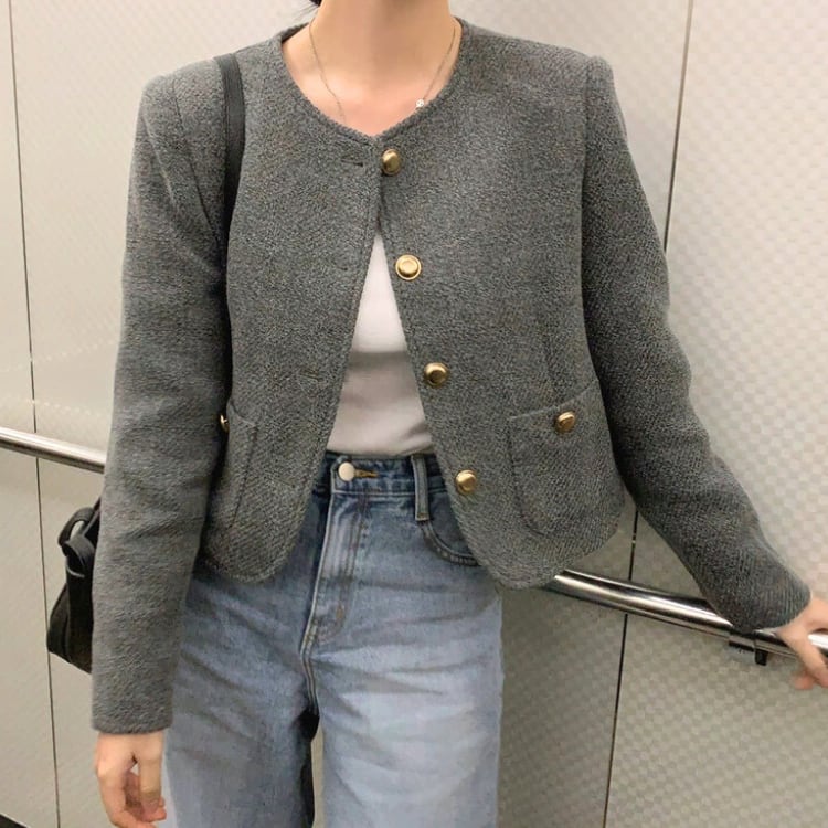 どんなスタイルにも合わせやすい、汎用性の高いクルーネックボタン留めジャケット。