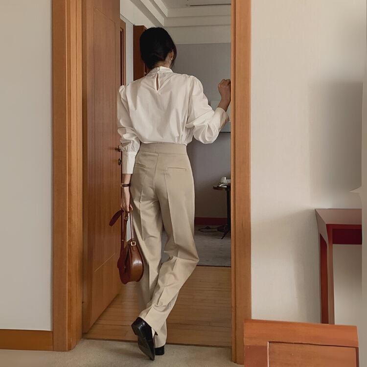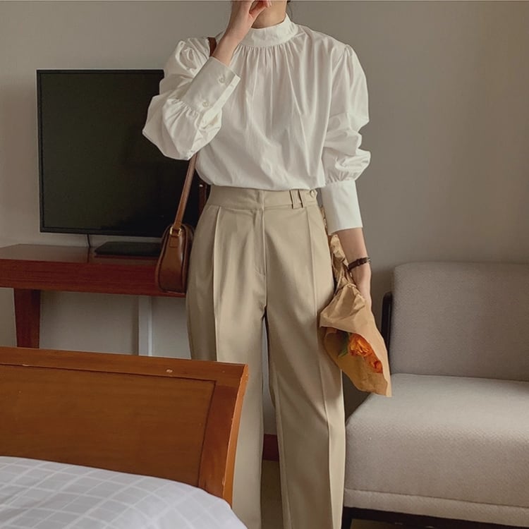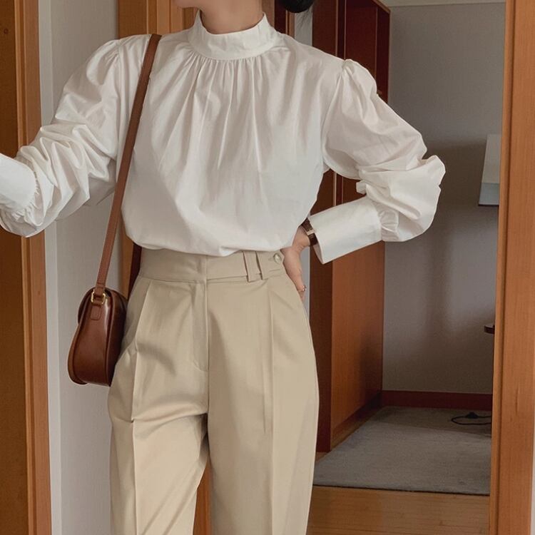 上品なハイネックと、女性らしいパフスリーブが特徴のロングスリーブシャツ。