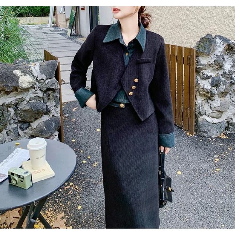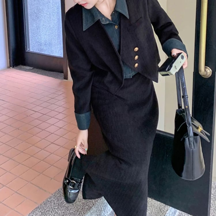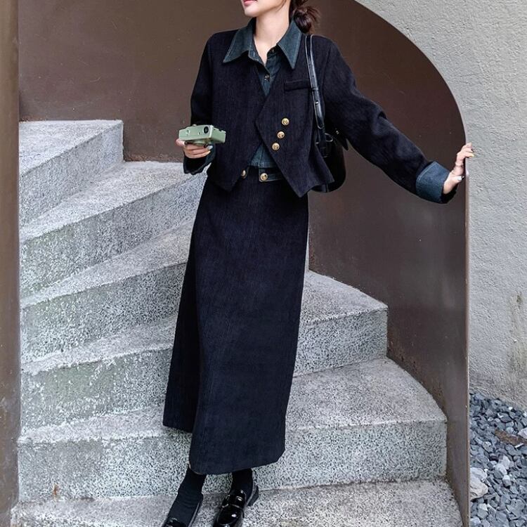 ジャケットとスカートのセットで、コーディネートの手間を省きつつ、洗練された印象を与えます。