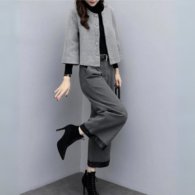 洗練されたスタイルを演出する、ノーカラーの七分袖ジャケットとワイドレッグパンツ(ベルト付き)のセットアップ。
