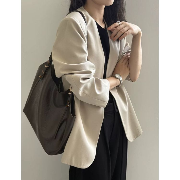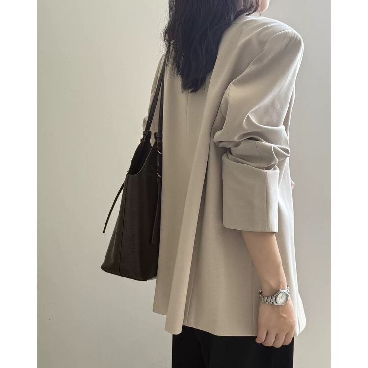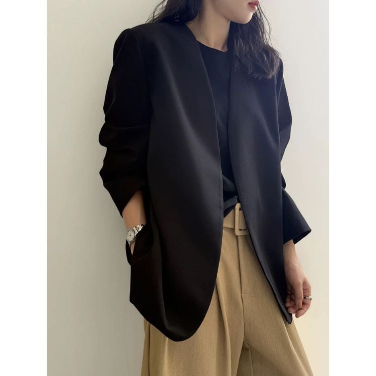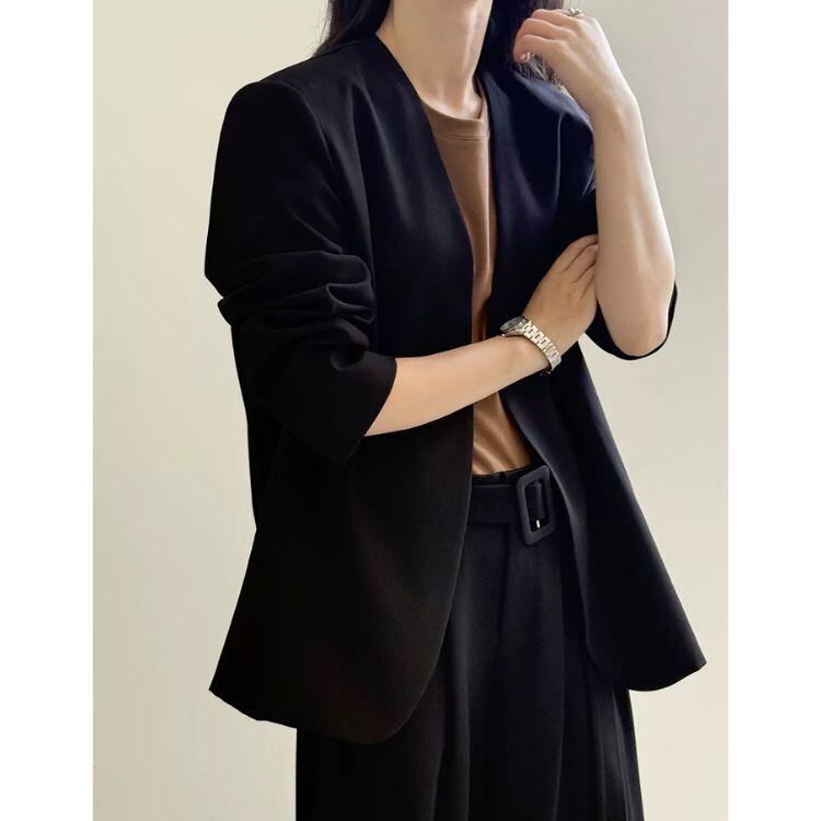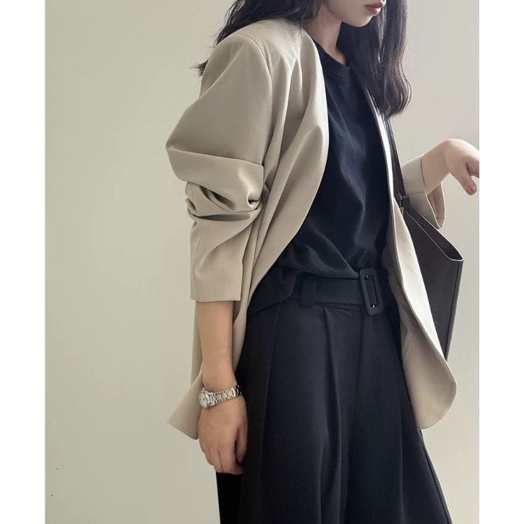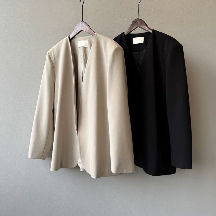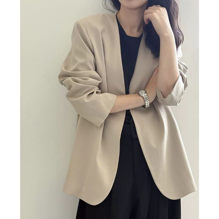 どんなシーンにも品良く馴染む、ミニマルなノーカラージャケット。