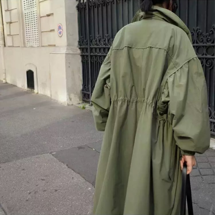 ルーズなシルエットと、スタイリッシュなハイネックデザインが特徴のロングコートです。