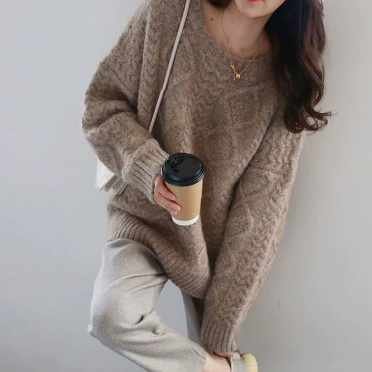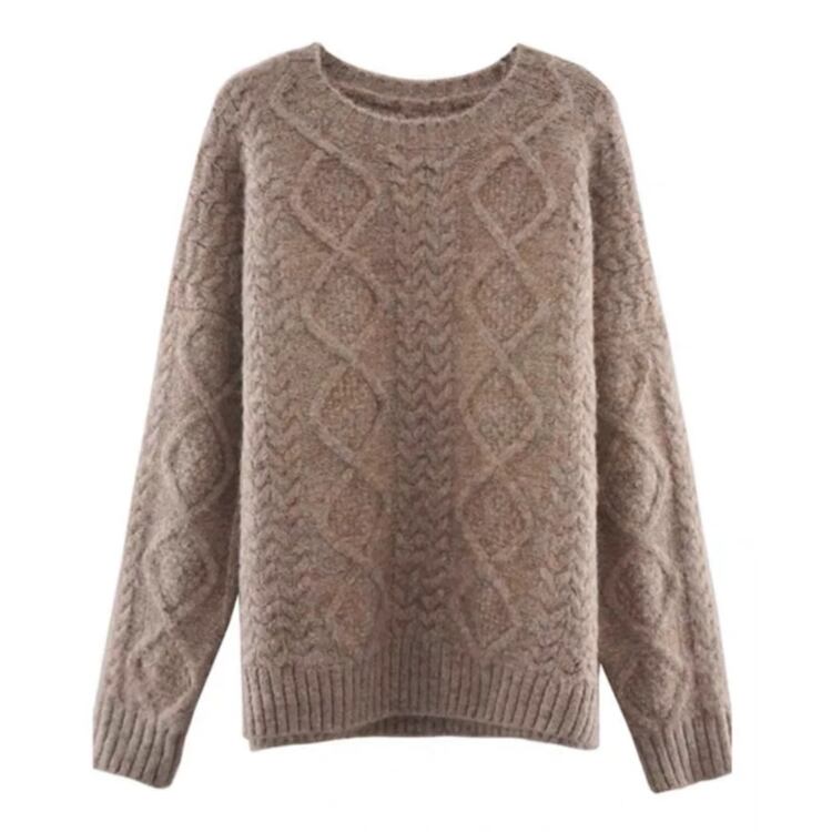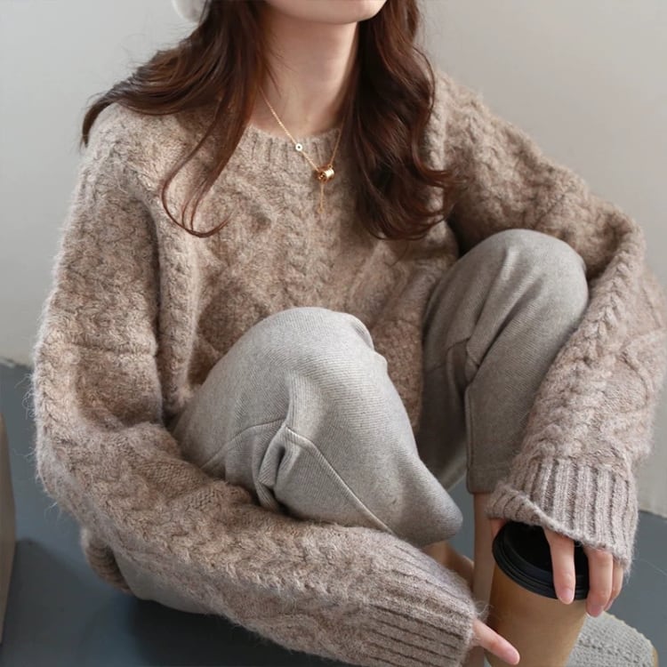 ゆったりシルエットとケーブル編みの表情で、大人の余裕を感じさせる一枚。