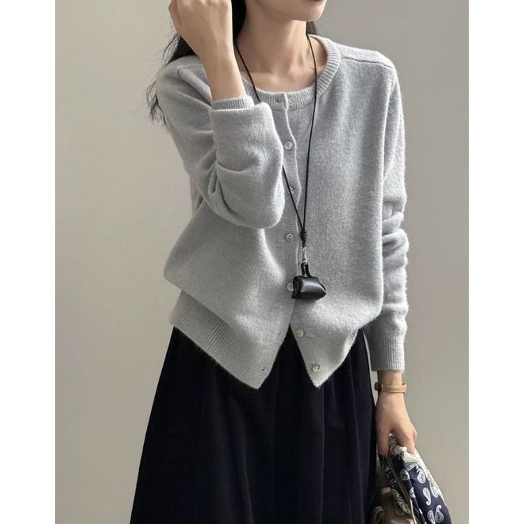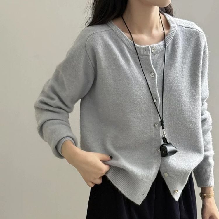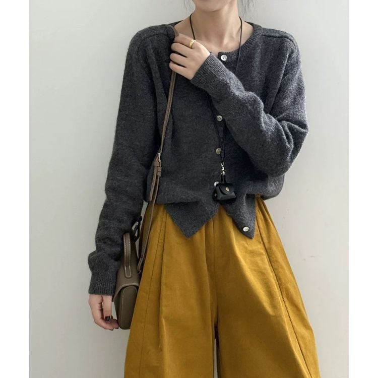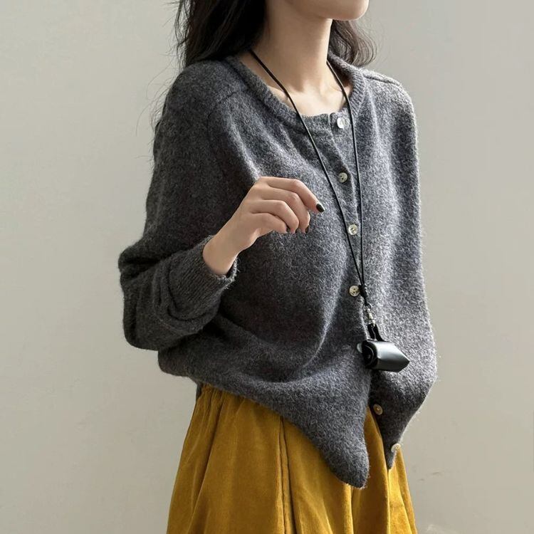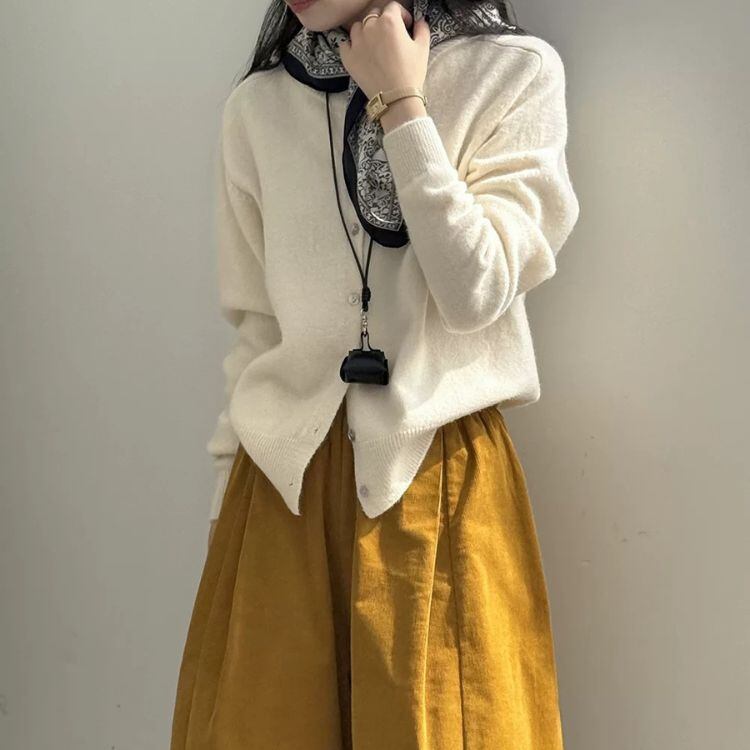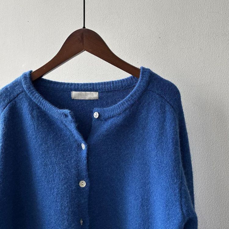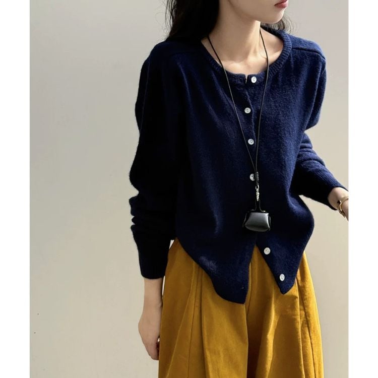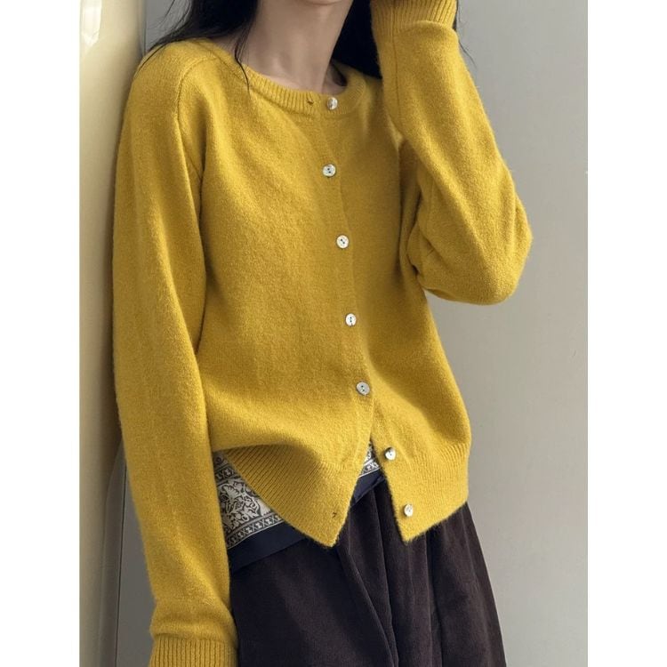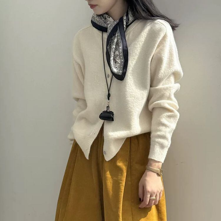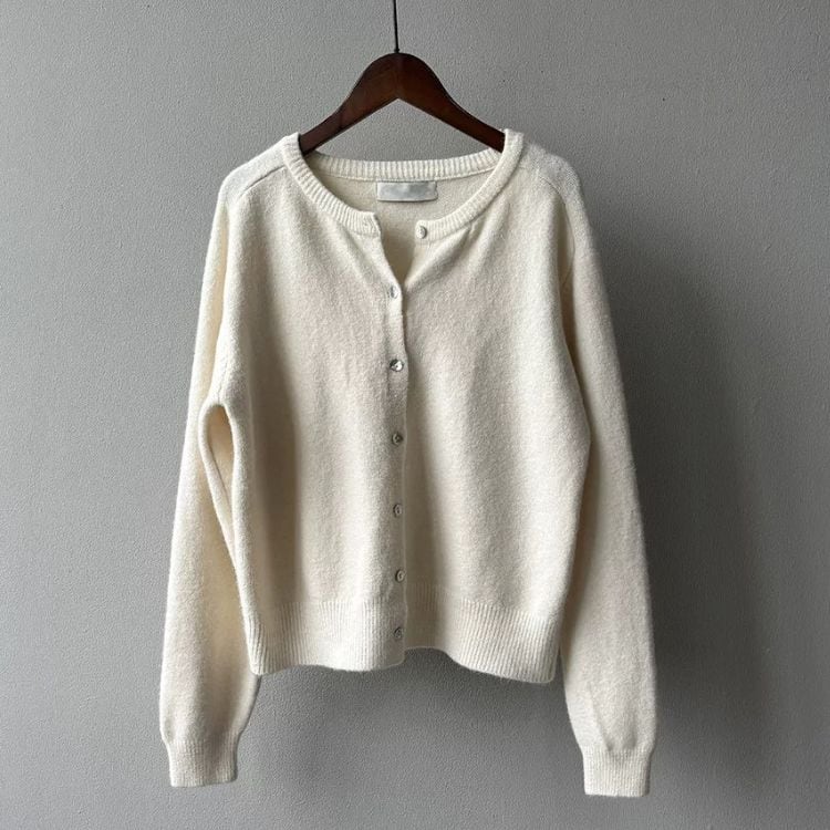 カジュアルにもきれいめにも着こなせる、ボタンフロントのニットカーディガン。