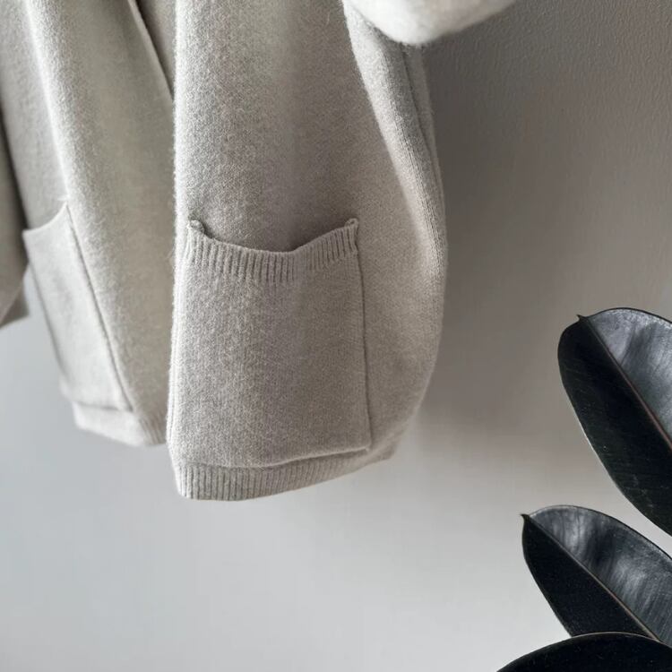 パッチポケットがアクセントになったヒップ丈のニットカーディガン。