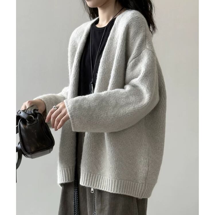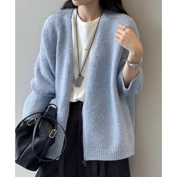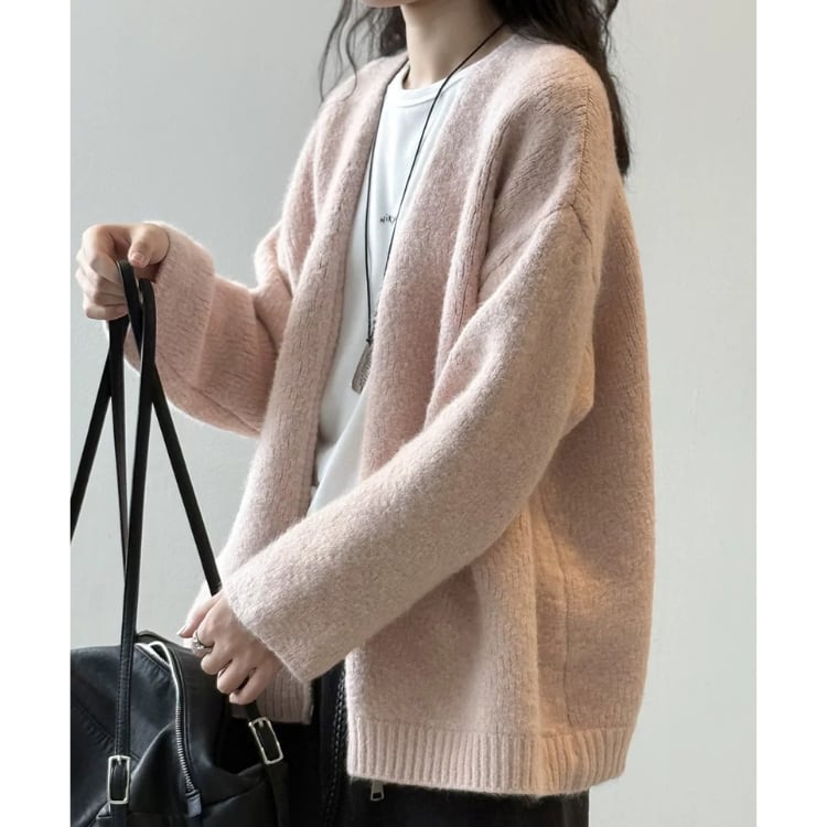 大人可愛い着こなしが叶う、ドロップショルダーのニットカーディガン。