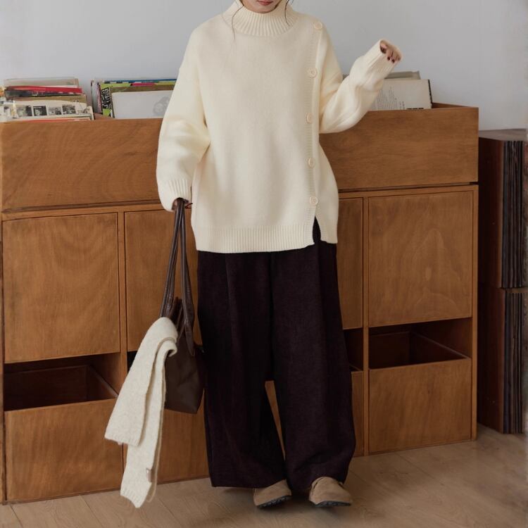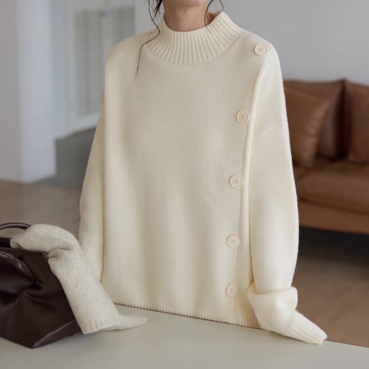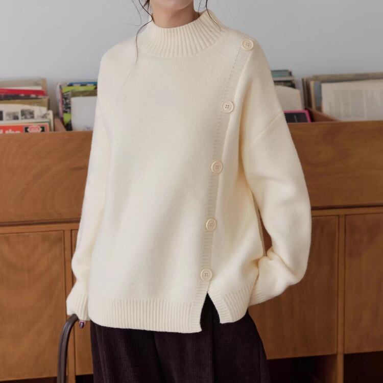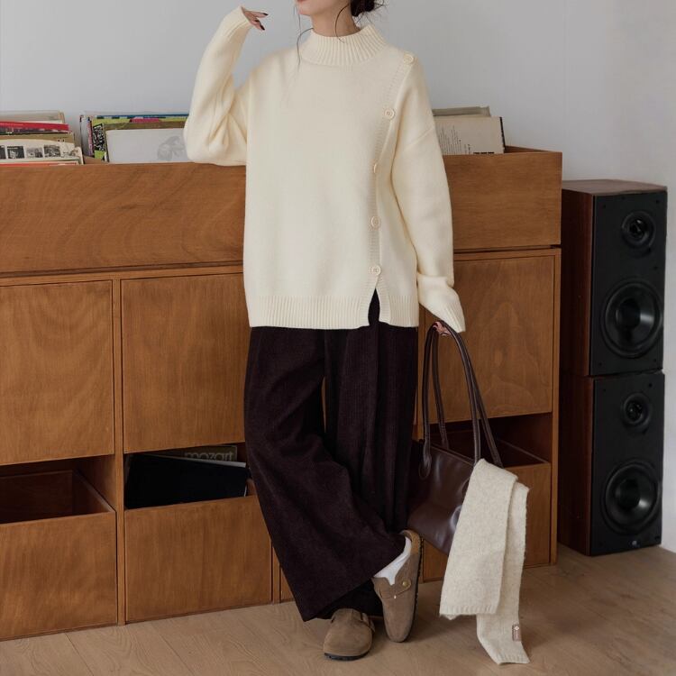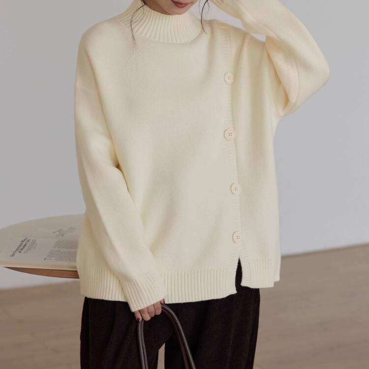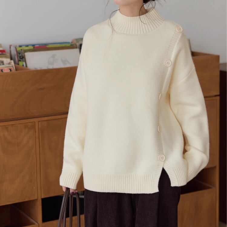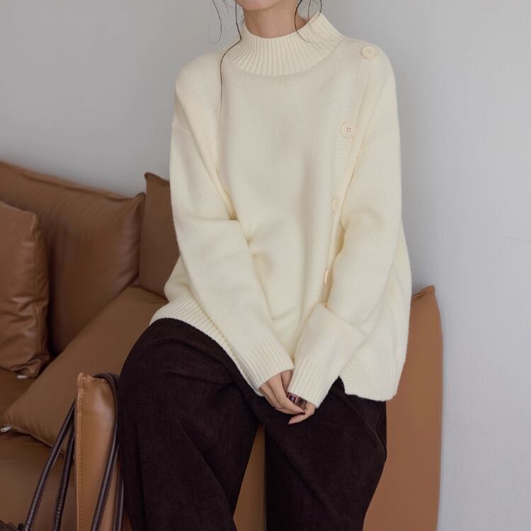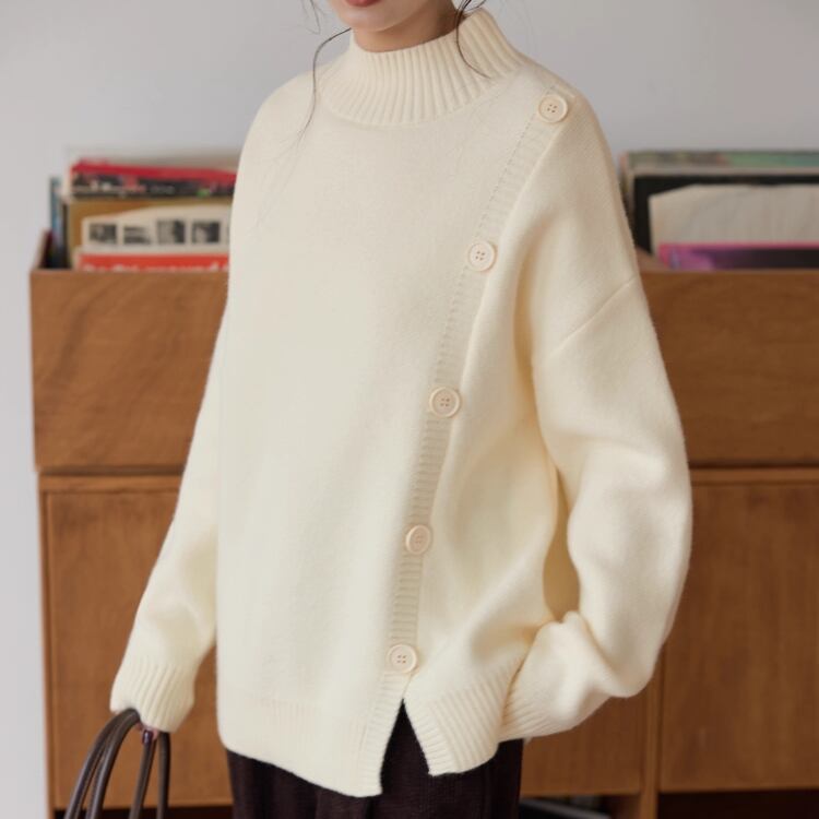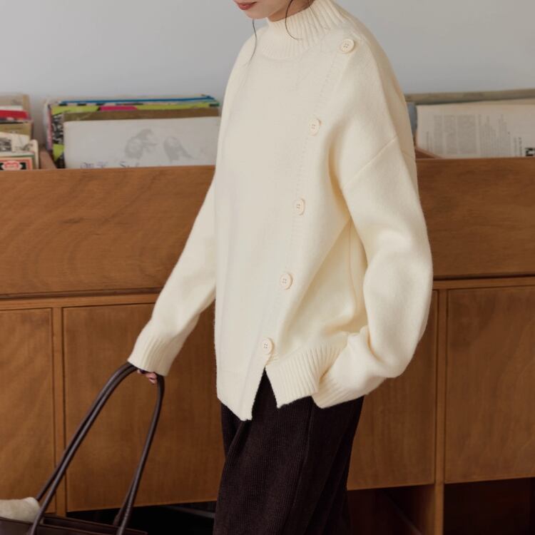 飾りボタンが目を引く、長袖ニットプルオーバー。