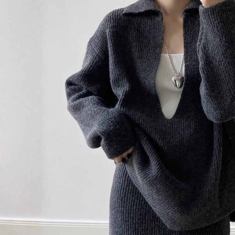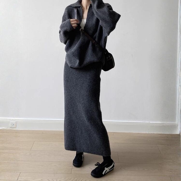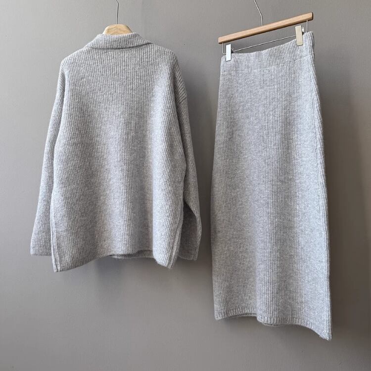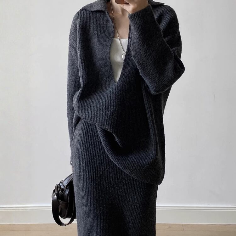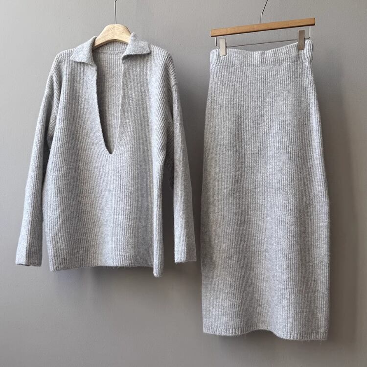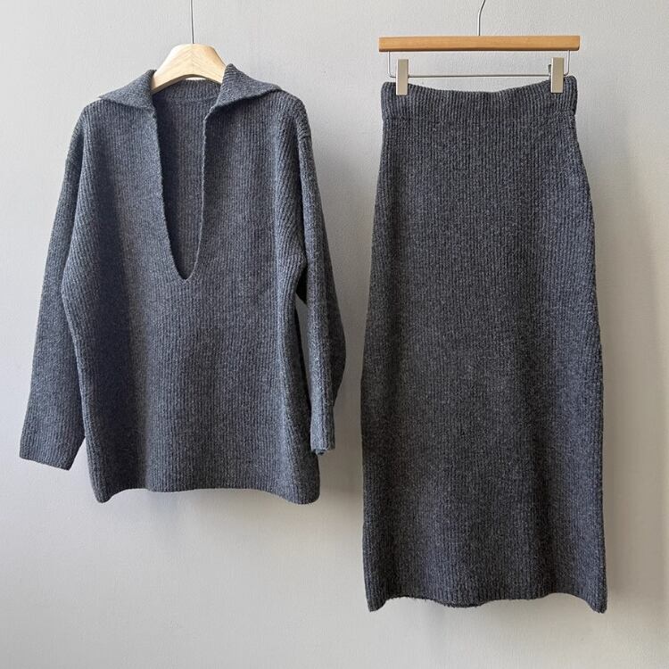 Vネックプルオーバー ロングペンシルスカート セットアップ 2col N00255