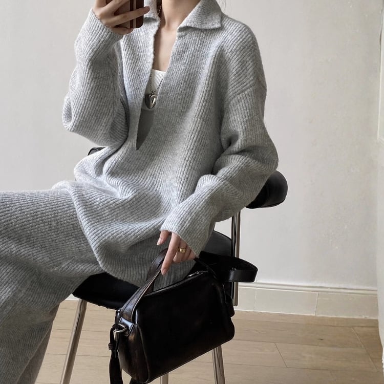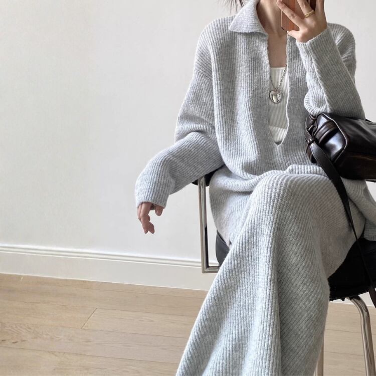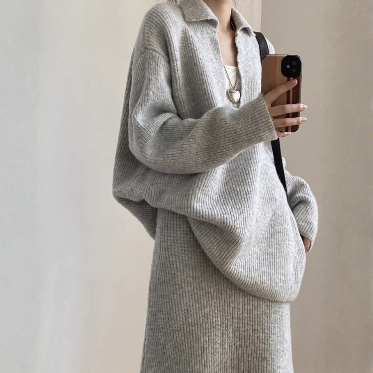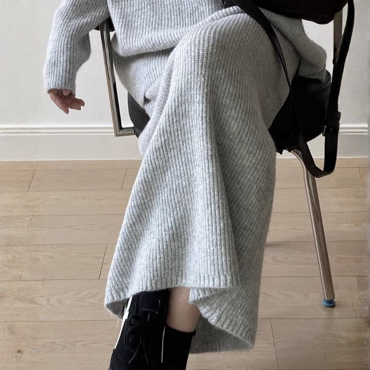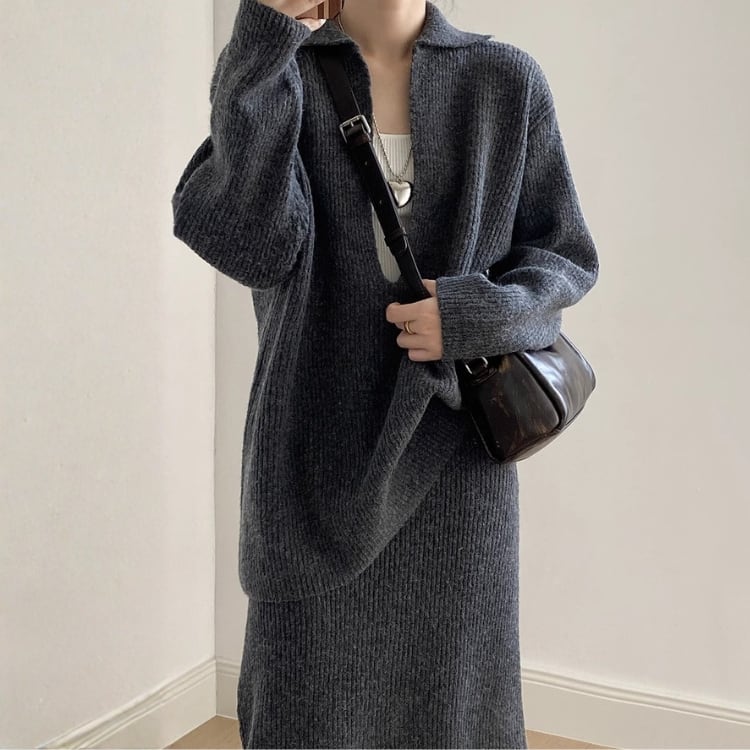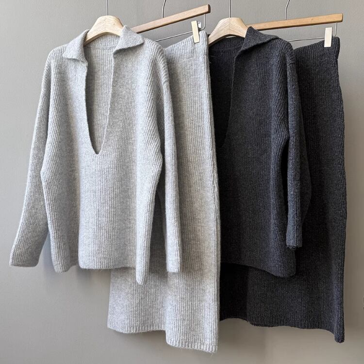 Vネックプルオーバー ロングペンシルスカート セットアップ 2col N00255